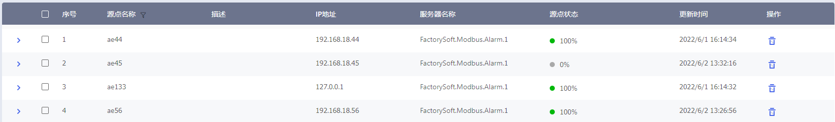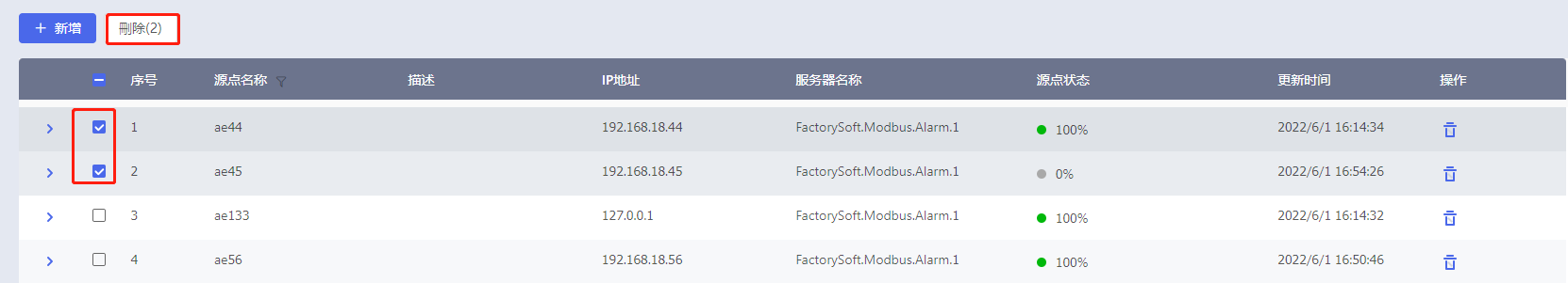 点击【源点管理】菜单,在显示信息页面,选择多个OPC AE源点,然后点击右上角的〔删除〕按钮,这些源点删除完成。