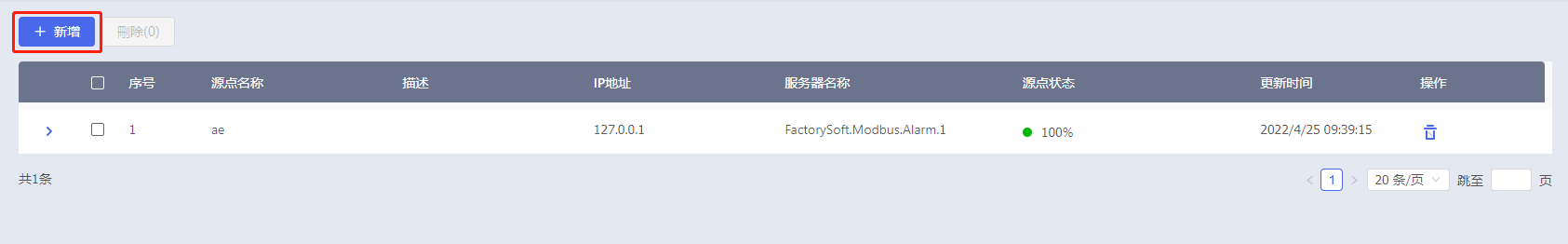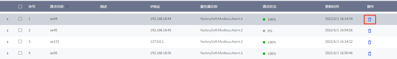 系统支持OPC AE源点单个删除和批量删除。删除源点后,对应OPC AE源点下所有的标签信息也会被删除,且删除后不可恢复请谨慎操作。