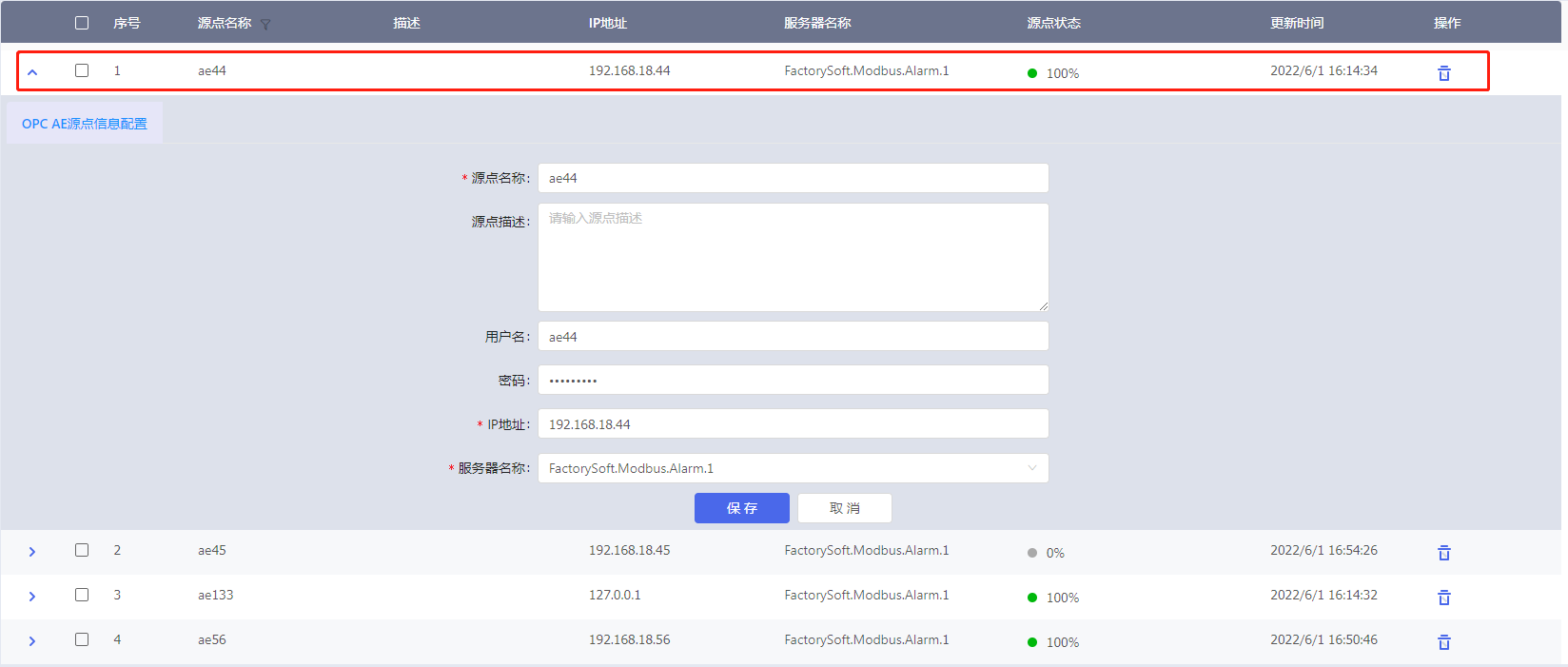点击【源点管理】菜单,在显示信息页面,以列表的方式显示所有OPC AE源点信息包括源点名称、源点描述、IP地址、服务器名称、源点状态、更新时间及操作,选择想要编辑的源点信息行(下图红色区域),展开源点信息配置页面,编辑完成后点击〔保存〕按钮即可修改成功。
