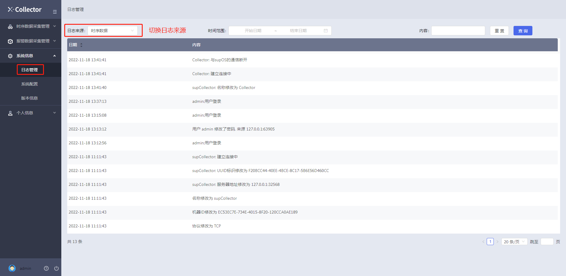 日志列表展示日志时间和日志内容,默认按日志时间倒序排序。可按照日志来源(时序数据、报警数据)切换查看。还可输入时间范围、日志内容关键字进行模糊查询。