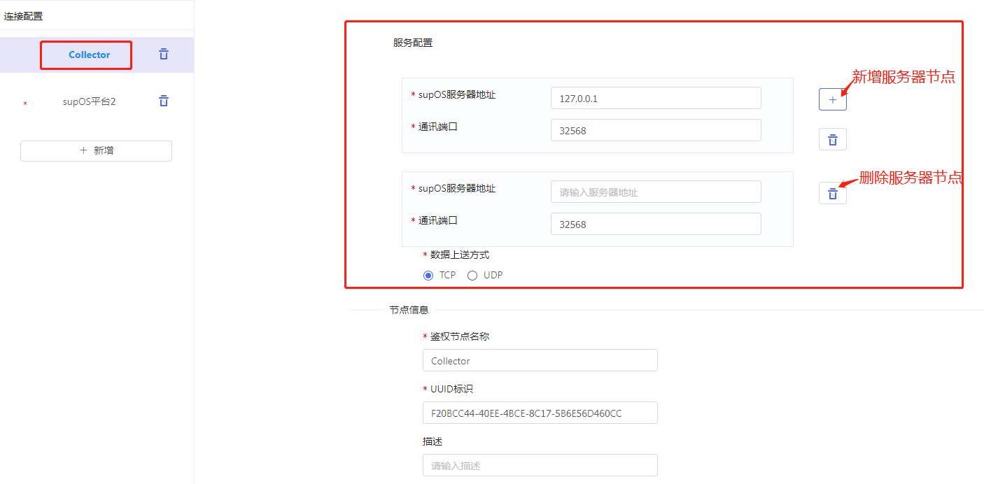 supOS集群部署时,仅支持TCP协议通信。采集器与supOS之间的通信IP可设置为集群中多个节点服务器的IP地址。点击〔+〕添加服务器节点,最多可添加5个。优先填写k8s workermain和k8s worker节点服务器的IP地址。