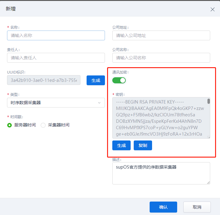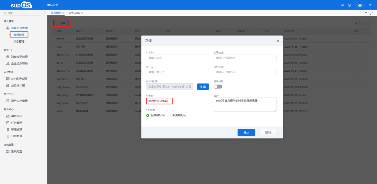 步骤1:在supOS端,【设备节点管理/鉴权管理】页面下点击〔新增〕按钮新增鉴权;输入名称、负责人、公司地址、公司名称、描述,点击〔生成〕按钮自动生成UUID,类型选择“时序数据采集器”,选择时间戳类型(上送数据使用supOS平台服务器的时间或采集器服务器的时间),选择是否开启supOS和采集器之间的通讯加密,点击〔确认〕。