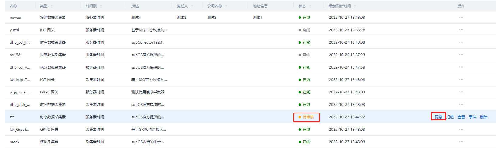 步骤1:在supOS端,【设备节点管理/状态管理】页面,查看状态为“待审核”。点击操作栏的〔同意〕按钮,同意采集器接入。