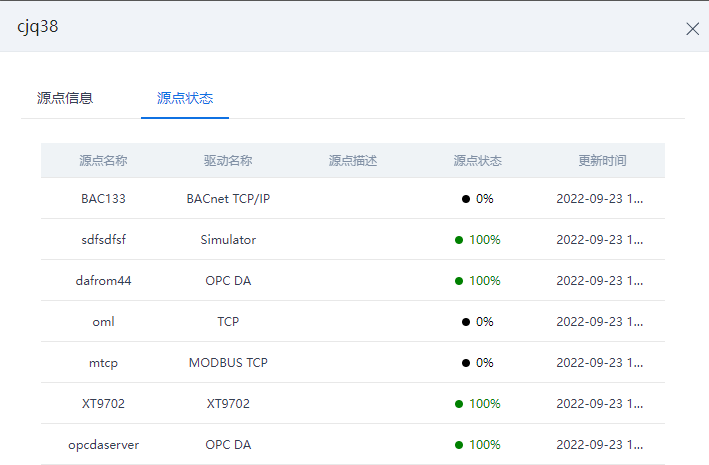 步骤4:在supOS【设备节点管理/状态管理】下点击采集器行操作栏中的查看按钮,选择“源点状态”页签,可以查看采集器源点状态。