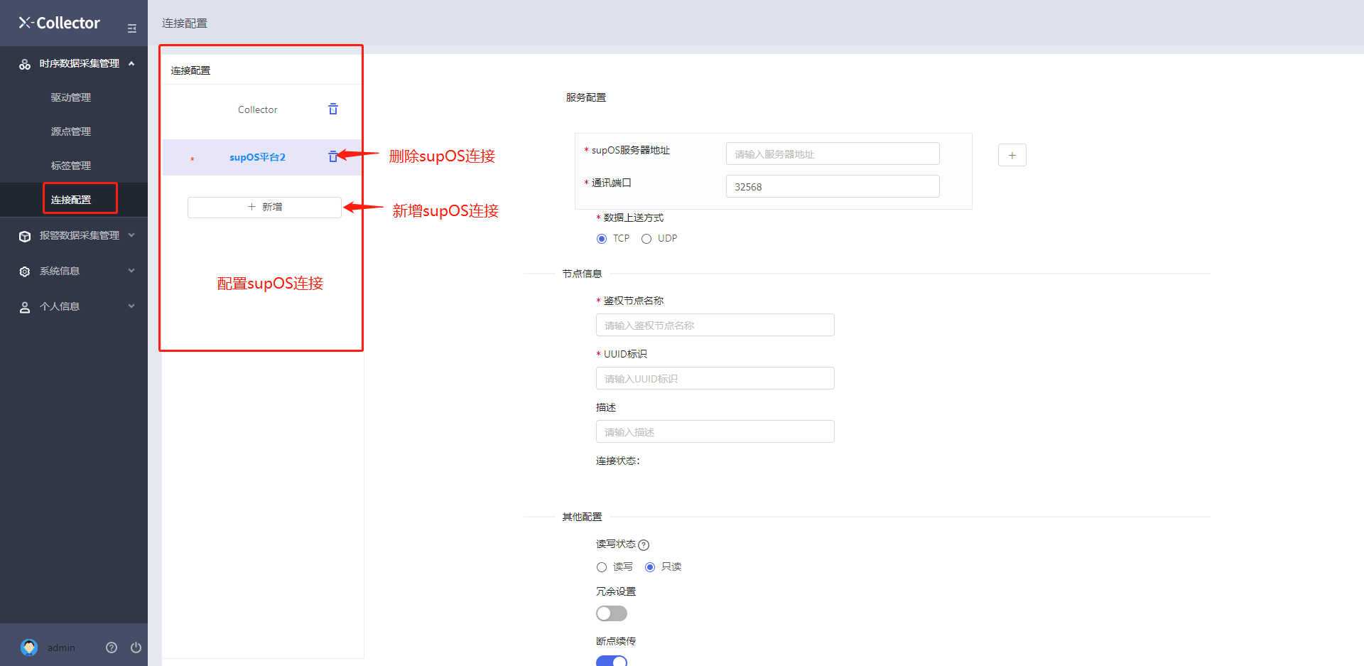 步骤2:新增supOS连接。一个采集器支持连接1-5套supOS平台进行数据上送。默认有一个连接配置。点击左侧连接配置下的〔新增〕按钮可新增supOS,单击