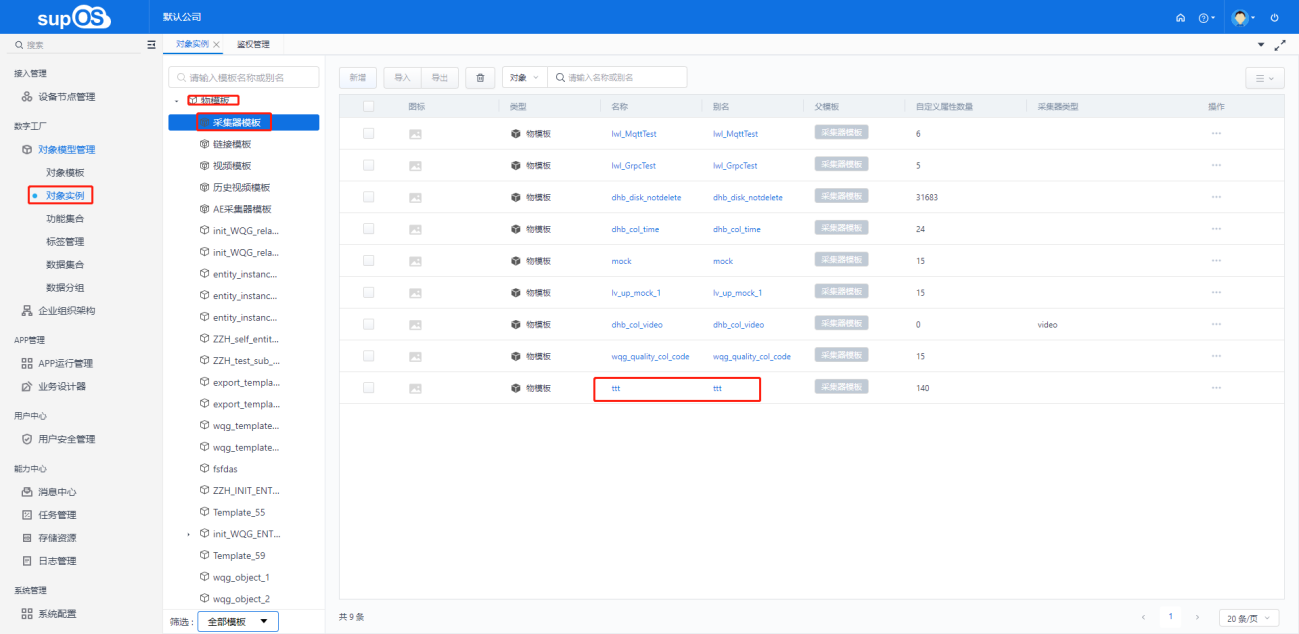 在supOS【对象模型管理】菜单下,在“对象实例/物模板/采集器模板”下自动新增一个对象实例,名称与新增鉴权名称一致,连接的位号均在该实例下。
